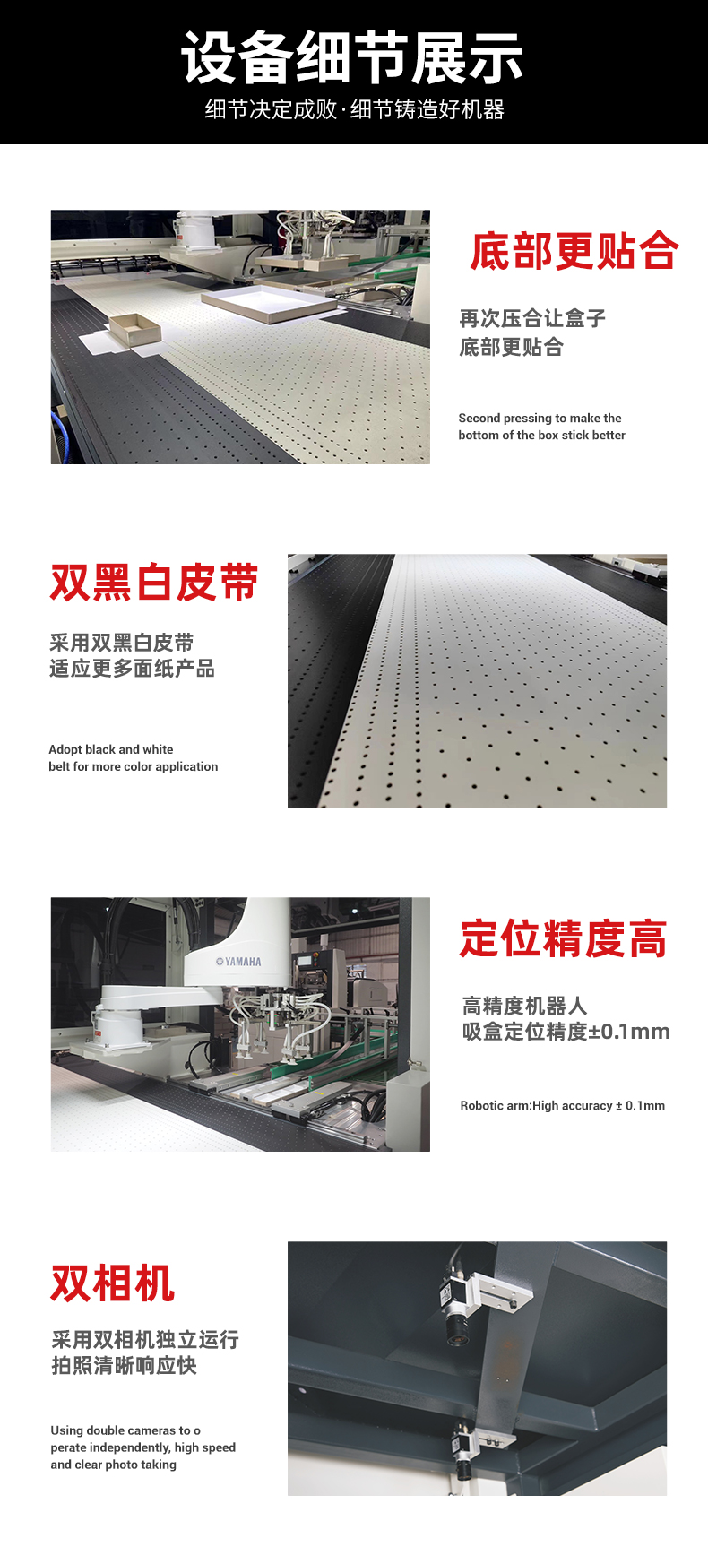 再次壓合讓盒子底部更貼合◆采用雙黑白皮帶適應更多面紙產品◆高精度機器人吸盒定位精度±0.1mm◆采用雙相機獨立運行拍照清晰相應快