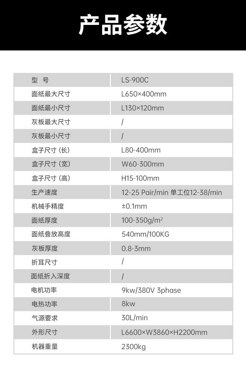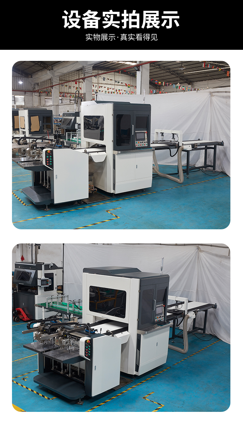 適合各種天地蓋的自動生產線,故障診斷功能,自動吸送面紙和送灰板功能,高精度凸輪飛達送紙,整機采用松下伺服控制系統,視覺定位系統及機器抓取,采用雅馬哈機器人,采用全新循環溫控上膠系統,采用高清攝像頭定位可精準定位天地盒、灰板、皮殼。