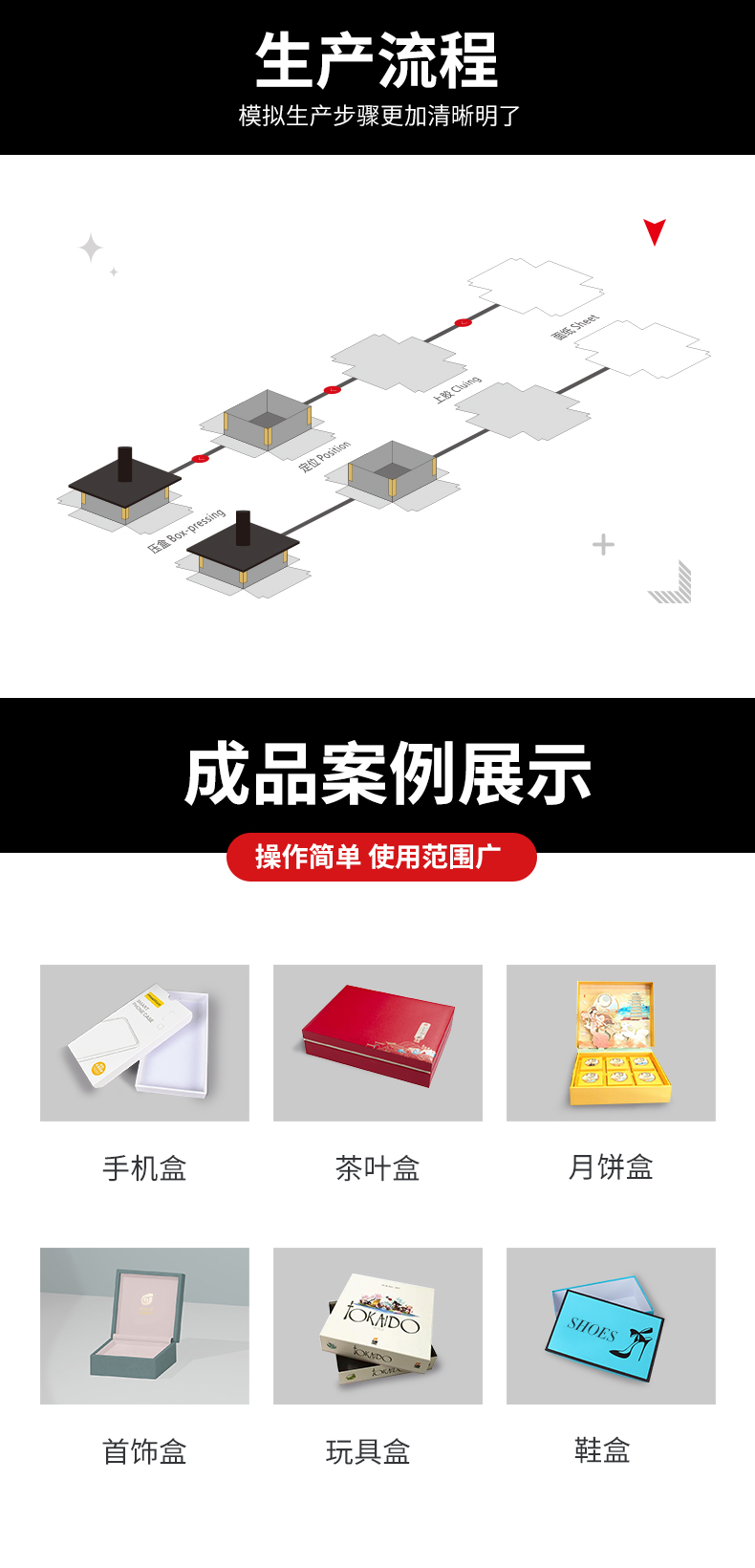 本機是加工精裝盒,天地盒的理想自動化設備,通過人工在流水線上將內盒和面紙定位好,再將定位好的紙盒放進機器木模上,機器自動運行,糊盒、折邊壓泡一次性完成。每分鐘可生產精裝盒多達30個,大大提高了精裝盒的生產效益,節省了生產成本。因每個動作都是機械式完成,使產品標準化生產,大大提高了產品的質量。