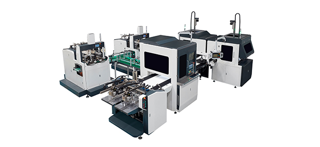 適合各種天地蓋的自動生產線,故障診斷功能,自動吸送面紙和送灰板功能,高精度凸輪飛達送紙,整機采用松下伺服控制系統,視覺定位系統及機器抓取,采用雅馬哈機器人,采用全新循環溫控上膠系統,采用高清攝像頭定位可精準定位天地盒、灰板、皮殼。